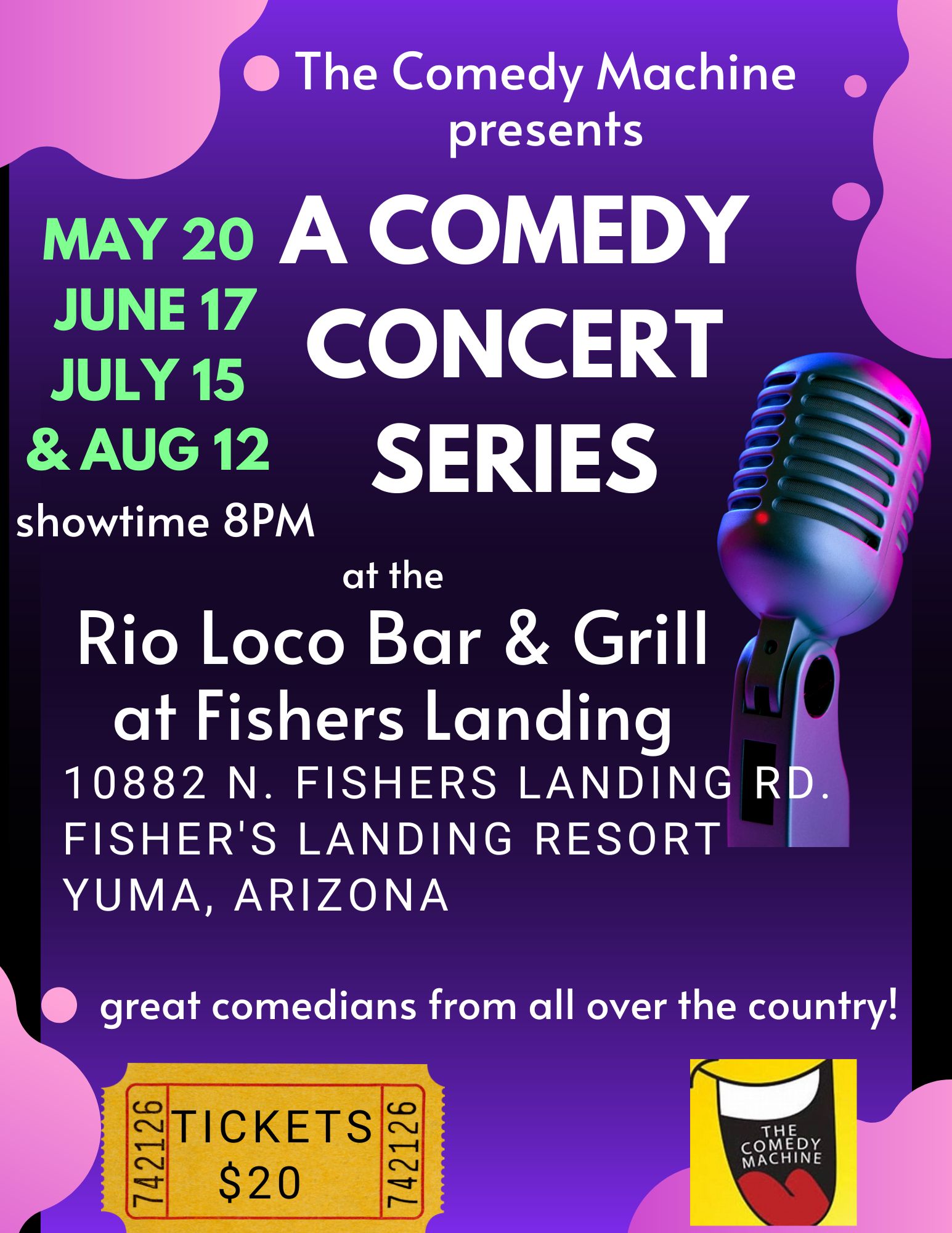 A Comedy Concert Series View Calendar Jun-16-23 8:00 pm - Jun-17-23 11:00 pm Rio Loco Bar & Grill Phone:(928) 782-7049Website:https://www.fisherslandingresort.com/bar-grill/ Twitter Facebook Google+ [{"latlong":["40.712784","-74.005941"],"zoom":"9","infow":"<\/span><\/div>\n\t\t\t <\/label>\n\t\t\t Jun-16-23 8:00 pm - Jun-17-23 11:00 pm <\/span>\n\t\t <\/div>","google_map_url":""}] Rio Loco Entertainment